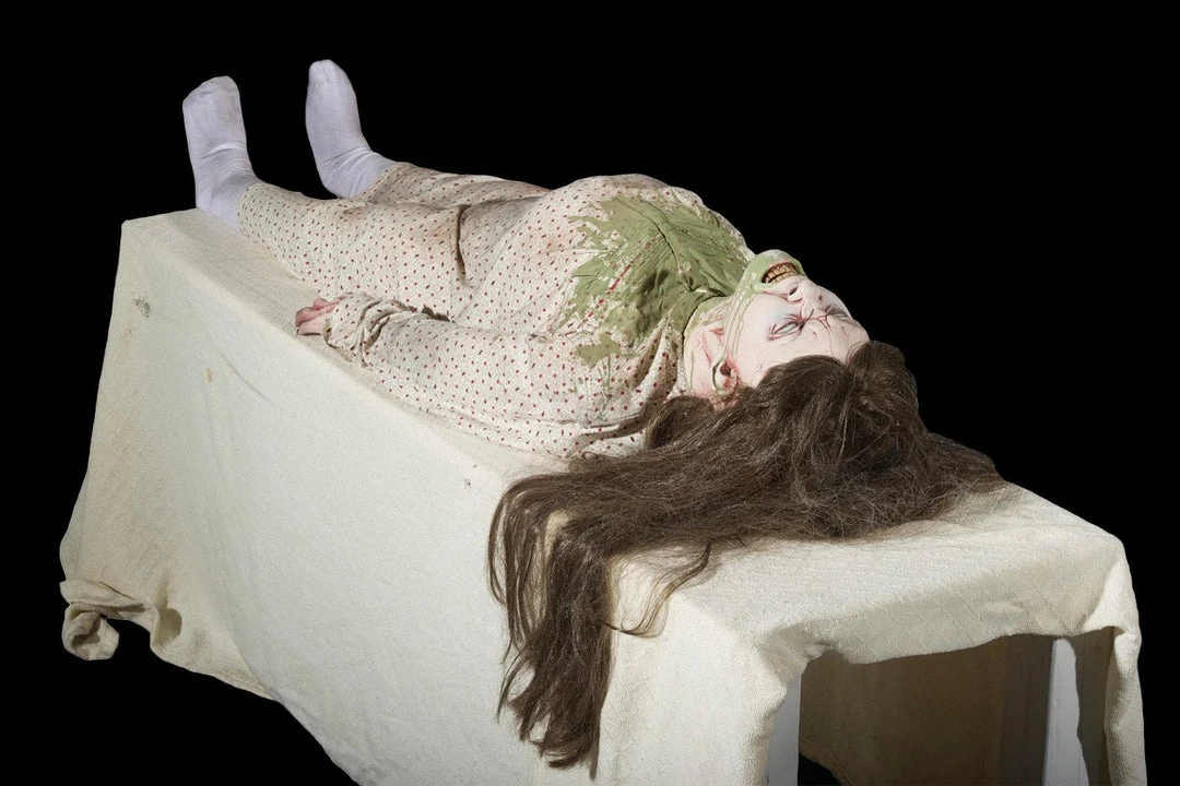 She’s possessed! Designed to lay on her back on floor or a table while she shakes violently while moaning and screaming. Soundtrack CD is included. Table and CD player not included. All electric, life size prop Clothing may vary.