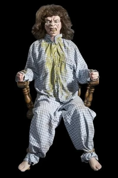 Possessed girl screams as she cranks her head all the way around. All electric Halloween Animatronic.
