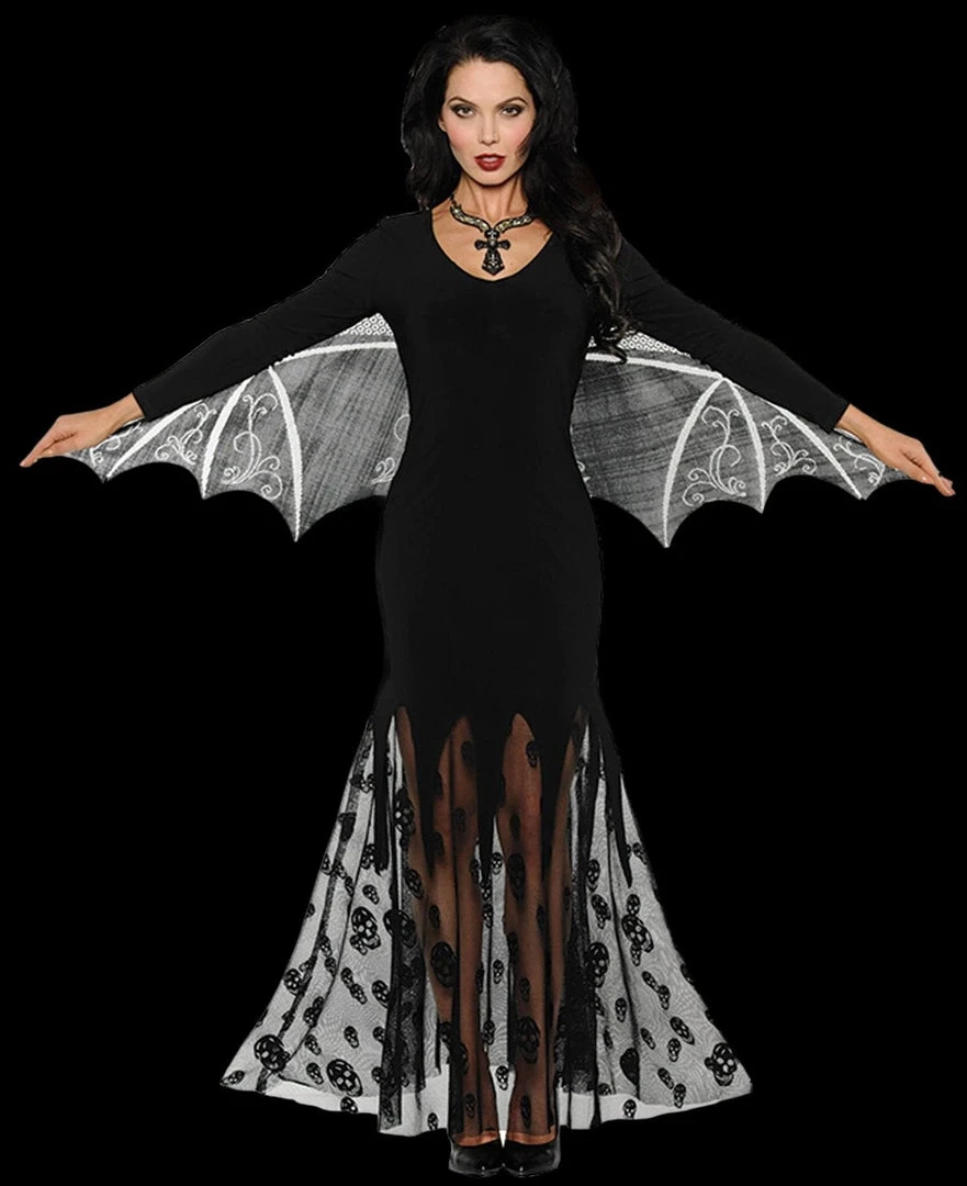 Overpower your prey in this incredibly sexy black vampiress dress! Black dress with skull design lace train and attached lace bat wings with finger rings. Shoes and necklace not included.