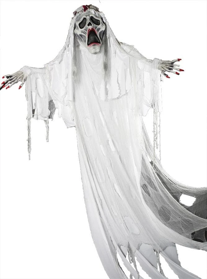 Ghost Hanging Bride- Horrifyingly scary hanging prop of ghost bride. Approximately 12 foot tall prop with enlarged head and hands. Comes with ghostly bridal gown.