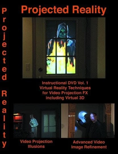 In-Depth Course on Video Projection methods for Halloween and Haunted Attractions, and Theatrical Scenes. This DVD contains the CORE methods for working with video projectors, and is considered a fundamental knowledge base for doing effective video projection illusions. It features Virtual 3D, which is Projected Video that appears to be 3D without the use of any glasses. It also covers projection effects on walls, ceilings and floors, OutDoor Hayride/Woods effects, sets, lighting, and fine tuning of the projected image. This video set is a primarily a how to and references a number of Virtual Effects DVDs sold separately, such as Spiders Snakes and Bats. However a 2nd DVD, Projection FX1 is included giving you a number of the effects to use. Included in this DVD is a chapter about Jon Hyers Visual Effects on-location installation of 12 video effects at a Horror Museum in St. Petersburg Russia. 2 hours of instructional material. Projection FX 1 DVD, (included) Contains, Ghost Opening a door and walking out, Ghost(s) walking up a stair case, Virtual Rats on the Floor, Luminous Ghosts, Cat Ghosts, Grim Reaper, Fire, Ghost from the Wall, various Human Ghosts, Flood Water. Projection FX Volume 1 also contains “some” of the Ghost Effects demonstrated in the 2004-2005 Ghost Machines How To Video Series