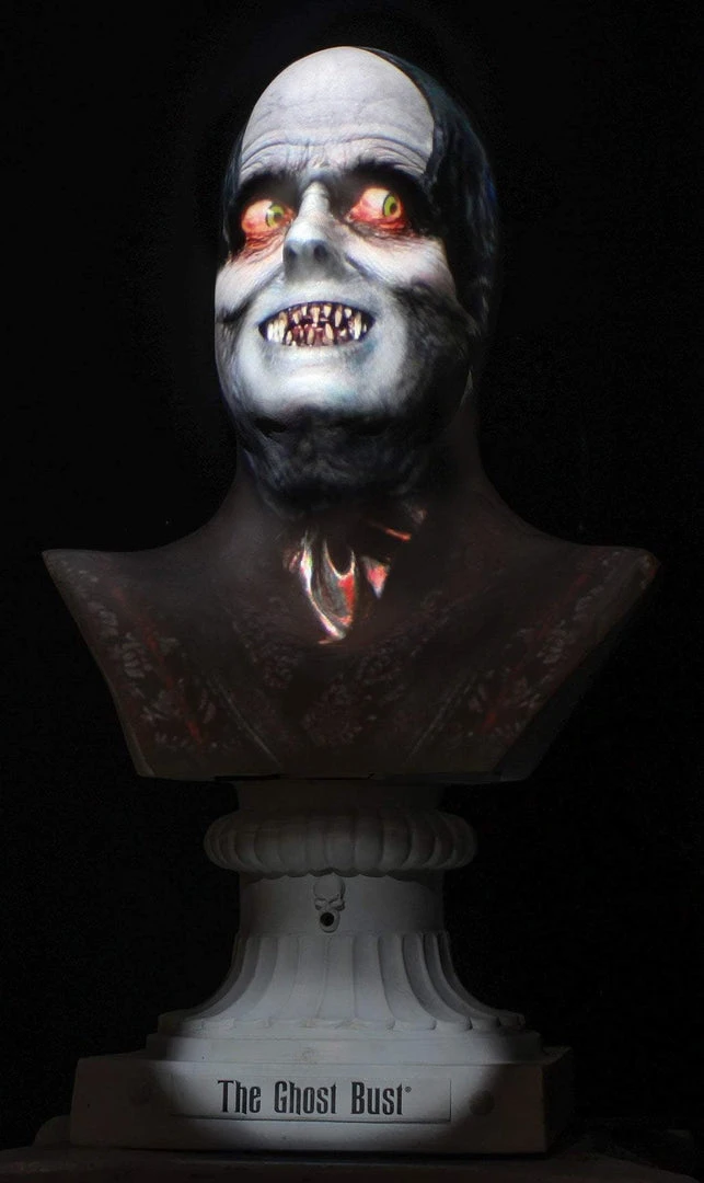 The Ghost Bust Projection System is an award-winning high-tech prop that consistently thrills audiences world-wide. It uses a discrete ceiling-mounted projector to project professionally produced video performances onto a specially formulated bust, mapping the video’s facial characteristics to exactly match the sculpted face of the statue. This creates an eerily realistic, breathtaking 3-D effect that captivates the audience’s attention.