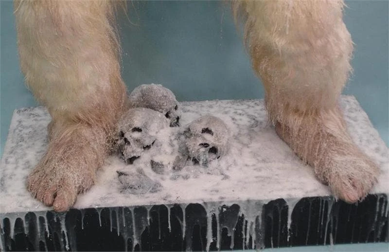 The Custom Full Sized Yeti Statue is a giant halloween decoration custom made in the USA. This hungry beast stands tall holding a frozen limb freshly ripped from the body of his latest victim and is looking for his next. The Yeti stands on a custom frozen snow covered base with the skulls of his victims. He is over 9 feet tall, filled with foam, and has the steel armature inside to keep his structural integrity. This high quality product is made with punched hair on the face and is made with real dyed yak fur for the authentic look you deserve.